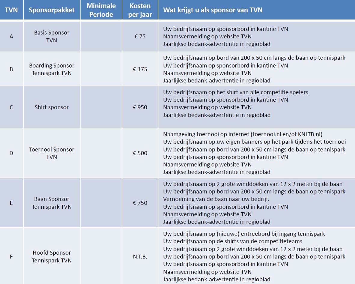 Tennis Vereniging Nieuwleusen is blij met haar sponsors en dat laten we merken door onze sponsors ieder jaar te bedanken middels een advertentie in de lokale media en door onze sponsors af en toe uit te nodigen voor bepaalde tennis-activiteiten.